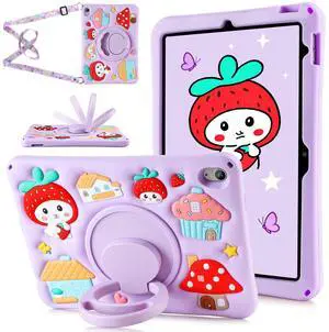 for iPad 10th Generation Case Kids Case for iPad (A16) 11th Generation 11 Inch (2025) with Rotating Kickstand Shoulder Strap Silicone Shockproof Protective Strawberry Tablet Cover 10.9", Purple