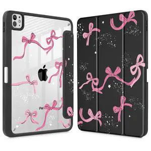 Cute Kawaii Pink Bow for iPad Pro 13 Inch Case (M5/M4) 2025/2024 with Pencil Holder, Auto Sleep/Wake, Black Leather Clear Acrylic Back Cover