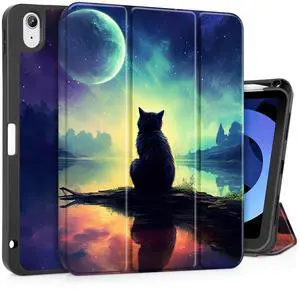 Tuiklol Case for iPad Air 11 inch (M3 2025/M2 2024) 7th/6th Gen/iPad Air 10.9 inch 5th/4th Gen 2022 2020 with Pencil Holder,Slim Protective Auto Sleep/Wake Trifold Stand Tablet Cover,Cat & Moon