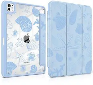Loyrina Case for iPad Pro 13 inch (M5) 2025 (M4) 2024 Release Slim Lightweight Cute Light Blue Cover with Clear Back TPU Edge Pencil Holder Trifold Stand, Starfish and Shells
