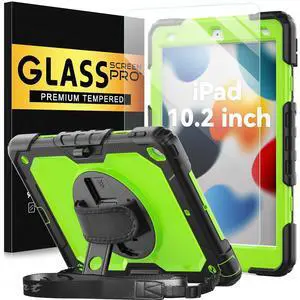 BLOSOMEET Case for iPad 9th/8th/7th Generation 2021/2020/2019 10.2 Inch with Tempered Glass Screen Protector & Pencil Holder,Protective Kids iPad 10.2 Case Cover w/Stand Hand Shoulder Strap,Green