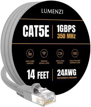 Lumenzi Cat 5e Ethernet Cable 14 FT in Grey 1 Gbps Speed Network Long Round Rj45 Outdoor Indoor Direct Burial Bare Copper LAN Patch Cable for Router Gaming PS5 XBOX Printer Computer CCTV Switch