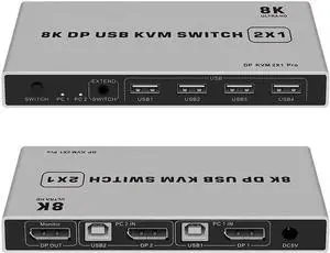 2 Port Dual Monitor Displayport KVM Switch, 2 in 2 Out DP1.4 KVM Switch for 2 Computers 2 Monitors Share Keyboard Mouse Printer Support 4K @120HZ 8K @60HZ with 4 Port USB 3.0 Support Desktop Control