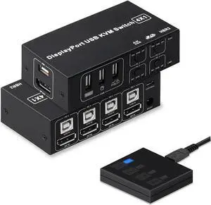 4 Port DisplayPort KVM Switch 3D UHD 4K@60Hz 4 in 1 Out USB and DP KVM Switcher for 4 PCs Share Keyboard Mouse Monitor and USB 2.0 Devices, with 4 USB Cables