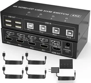 4 Port HDMI + DisplayPort KVM Switch Dual Monitor, UHD 4K@60Hz, KVM Switch 2 Monitors 4 Computers with 4 USB 2.0 Hub, Keyboard Video Mouse Peripherals Switcher for 4 PCs Dual Monitors