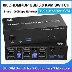 HDMI + 2 Displayport Triple Monitor KVM Switch 8K@60Hz 3 Monitors 2 Computers, 4K@120Hz USB 3.0 DP KVM Swticher for 2 PC Share 3 Monitors and 4 USB Devices, Support Extended & Copy Mode