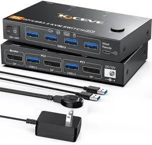 2 Port DP KVM Switch 2 Computer 1 Monitor, DisplayPort USB 3.0 KVM Switch Displayport 2.1 8K@60Hz 4K@144Hz for 2 PC Share One Monitor and Keyboard Mouse, with Wired Remote and Power Adapter