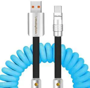 chubbycable Curly Chubby - 240W Coiled USB C Cable Spring Retractable Fast Charging Cable for Car Compatible with CarPlay, Android Auto, Light Blue and Black, USB-A to Type-C, 2.29FT-3.6FT
