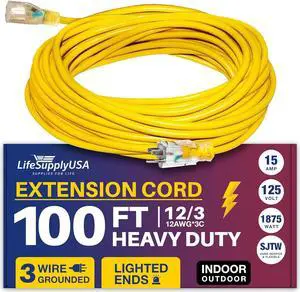 50 ft extension cord 16/3 sjtw with lighted end - yellow - indoor / outdoor heavy duty extra durability 13amp 125v 1625w etl listed by lifesupplyusa