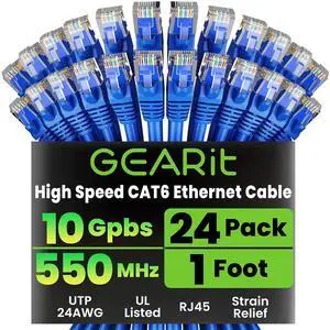 GEARit Cat 6 Ethernet Cable (24-Pack 1 Foot) Cat6 Network Patch, 10Gbps, RJ45, Snagless Cord, Gold-Plated Connectors, Internet for PC, TV, Tablet, Router, Printer, Servers, IT Data Center - Yellow- Model #: C0A525287560441454
