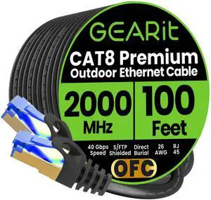 GEARit Cat8 Outdoor Ethernet Cable (100 Feet) Waterproof, Direct Burial, In-Ground, LLDPE UV Jacket, Pure Copper, 26AWG, 40Gbps 2000Mhz SFTP Patch Cord, POE, Network, Internet, Cat 8 Cable - 100ft