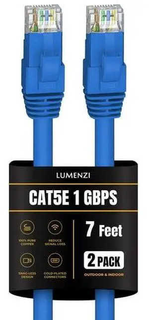 Lumenzi Cat 5e Ethernet Cable 7 FT in Blue 2 Pack 1 Gbps Speed Network Round Rj45 Outdoor Indoor Direct Burial Bare Copper LAN Patch Cable for Router Gaming PS5 XBOX Printer Computer CCTV Switch