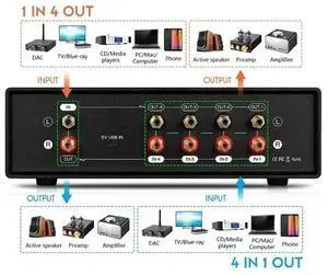 MIC+LINE Analog Dual VU Meter Sound Level DB Panel Display 4-Way Audio Splitter Switcher Box Music Spectrum Visualizer