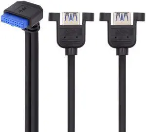 Cablecc Down Angled 19/20Pin Header to USB 3.0 Dual Ports Female Screw Mount Type Cable 90 Degree 5Gbps