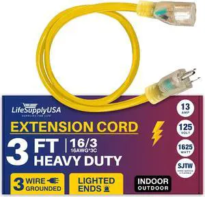 3FT Power Extension Cord Outdoor & Indoor - Waterproof Electric Drop Cord Cable - 3 Prong SJTW, 16 Gauge, 13 AMP, 125 Volts, 1625 Watts, 16/3 by LifeSupplyUSA - Yellow (1 Pack)