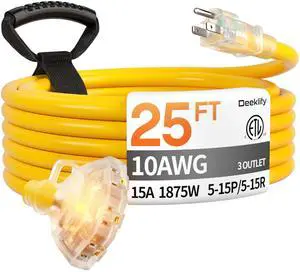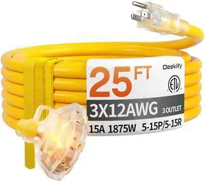 Features: This 25 FT power extension cord is made by Deeklify and features a style with material. It supports a voltage of 125 volts_of_alternating_current and an input current of . The cable is Yellow in color and is UL listed. It comes with a Male-to-Female connector and does not require batteries.