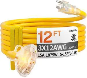 Features: This 12 FT power extension cord is made by Deeklify and features a style with material. It supports a voltage of 125 volts_of_alternating_current and an input current of . The cable is Yellow in color and is UL listed. It comes with a Male-to-Female connector and does not require batteries.