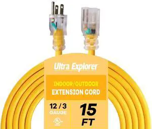 • Features: This 15 ft power extension cord is made by Ultra Explorer and features a style with copper material. It supports a voltage of 125 volts_of_alternating_current and an input current of . The cable is Yellow in color and is UL listed. It comes with a Male-to-Female connector and does not require batteries.