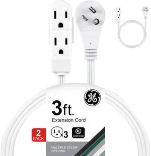 Features: This 3 Ft 2 Pack power extension cord is made by GE and features a 2 Pack style with copper material. It supports a voltage of 125 volts and an input current of . The cable is White in color and is UL listed. It comes with a Male-to-Female connector and does not require batteries.