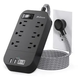 Flat Extension Cord 20 FT Multiple Outlets- Surge Protector Power Strip 8 AC Outlets 3 USB Fast Charge (3.4A 17W) 1080 Joules Long Braided Cord Wall Mountable for Home Office College Dorm 13A 1625W