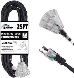 Features: This 25FT power extension cord is made by HONDERSON and features a 12/3 style with Copper material. It supports a voltage of 125 volts and an input current of . The cable is Black in color and is UL listed. It comes with a Male-to-Female connector and does not require batteries.