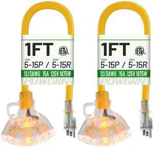 Features: This 1FT-2pc power extension cord is made by POWGRN and features a 3 Outlet style with copper material. It supports a voltage of 125 volts_of_alternating_current and an input current of . The cable is Yellow in color and is UL listed. It comes with a Male-to-Female connector and does not require batteries.