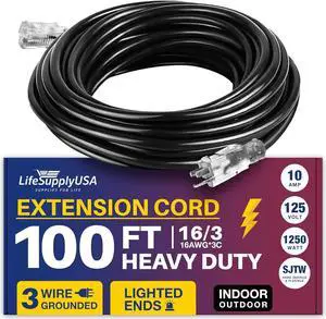 100FT Power Extension Cord Outdoor & Indoor - Waterproof Electric Drop Cord Cable - 3 Prong SJTW, 16 Gauge, 10 AMP, 125 Volts, 1250 Watts, 16/3 by LifeSupplyUSA - Black (1 Pack)