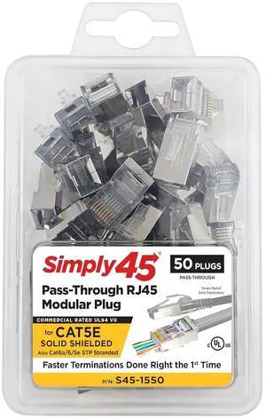 Simply45 Shielded Internal Ground Pass-Through RJ45 Modular Plugs for 24AWG Solid (Cat5e STP), 28-26AWG Stranded (Cat5e/6/6a STP Stranded) - 50-Piece/Jar - S45-1550