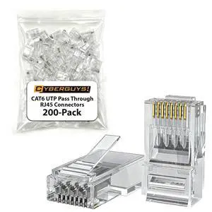 Cyberguys CAT6 UTP Pass Through RJ45 Connectors 200-Pack Gold-Plated 50 8P8C Modular Plugs, Supports 2425AWG Ethernet Cables, 10Gbps High-Speed Network Ends, Easy Install with Crimp Tools 200-Pack