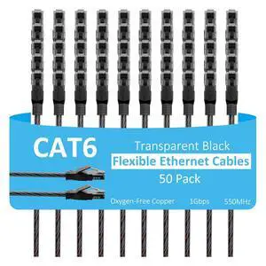Cat6 Ethernet Cable 6 FT (50-Pack), Snagless Cat 6 Patch Cable, Upgraded Transparent Flexible PVC Jacket, OFC Oxygen-Free Copper, 1Gbps, Internet Network Cable, Cat6 Cables, UTP, Black Cable -50 Pack