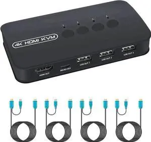 KVM Switch 4 Ports, HDMI USB Selector for 4 Computers Share Keyboard Mouse Printer and One HD 4K Monitor, Including 4 KVM Cables