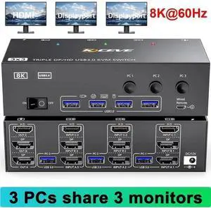 KVM Switch 3 Monitors 3 Computers 8K@60Hz, 1* HDMI + 2* Displayport Triple Monitor USB 3.0 KVM Switches with 4 USB 3.0 Ports for Keyboard Mouse Printer, Wired Remote & Power Adapter included