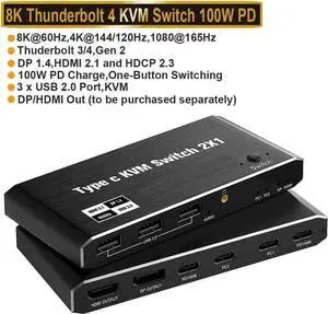 2x1 USB C KVM Switch 8K@60Hz 4K@120Hz, 2 Port Type C KVM Switch for 2 Computers Share 1 Monitor (HDMI or DP Output), USB C KCM with 4 USB 2.0 Ports, 2 USB-C Cables Included