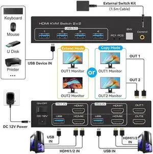 4K Dual Monitor HDMI KVM Switch 2 Monitors 2 Computers 4K@60Hz, USB 3.0 2x2 HDMI KVM Switcher PC Extended Display for 2 PC Share 4 USB 3.0 Devices, Desktop Controller & 2 USB Cables Included