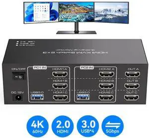 HDMI KVM Switch 2 Monitors 3 Computers 4K@60Hz, Dual Monitor HDMI USB 3.0 KVM Switches for 3PC share 2 Monitors and 4 USB Devices, Wired Remote, Power Adapter and USB 3.0 Cables Included