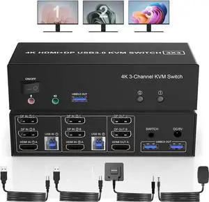 1 HDMI + 2 Displayport 3 Monitor KVM Switch USB 3.0 for 2 Computers, 4K@60Hz Triple Monitor KVM Switch with Audio and 3 USB 3.0 Ports, 2 Computers Share 3 Monitors Keyboard Mouse Switcher