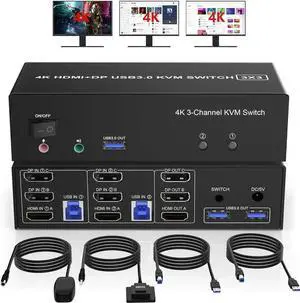 Triple Monitor HDMI+DP+DP KVM Switch 3 Monitors 3 Computers 4K@144Hz 8K@60Hz, 2 Displayport + HDMI USB 3.0 KVM Switches with 4 USB 3.0 Port, Wired Remote,Power Adapter & USB 3.0 Cables Included