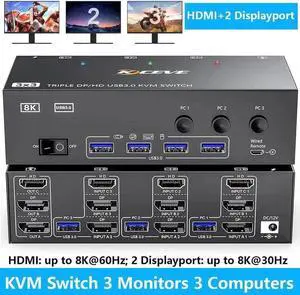 KVM Switch 3 Monitors 3 Computers, Dual/Triple Monitor HDMI + 2 Displayport KVM Switches Support 8K@60Hz/30Hz,2K@144Hz, USB 3.0 Computer Switch for 3 PCs Share 3 Monitors, Support Extended Mode