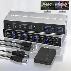KVM Switch 4 Computers 2 Monitors Displayport and HDMI 4K@60Hz, USB 3.0 4 Port Dual Monitors KVM Switch with Audio Microphone Output and 3 USB 3.0 Ports, 4 in 2 Out Monitor Switch for 4 PCs