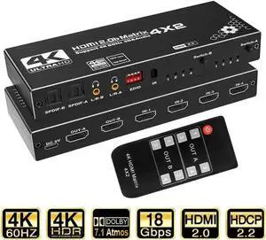 4in 2out HDMI Matrix, 4K 4x2 HDMI Matrix Switch, 1080P 3D, RGB 8:8:8(Dolby ATMOS), 2xSPDIF Audio, 2x3.5mm L/R, EDID, IR Remote (OZJ1)