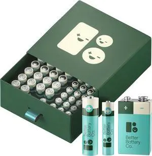 Better Battery Co. Variety Pack AAA & AA & 9V Mixed Batteries High-Performance Carbon Neutral Batteries with Organizer Box & Built-in Recycling Program Bulk Combo Set 22x AA, 22x AAA & 2X 9V