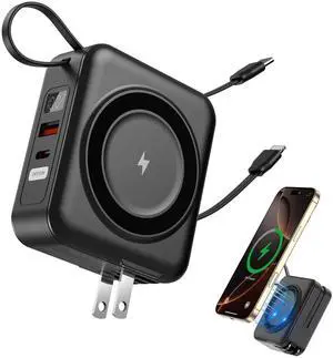 for Magsafe Portable Charger with AC Wall Plug, 6-in-1 Magnetic Wireless Power Bank 10000mAh Built-in Cables, 22.5W Type-C in&Out Fast Charging Battery Pack for iPhone17/16/15/14/13/12 Series, Black