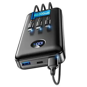 Portable Charger Power Bank - 60,000mAh Battery Pack, 22.5W Fast Charging Phone Charger Attached USB-C/iOS/Micro-USB Cable, Powerbank for iPhone 17 16 15 14 13 Samsung, for Travel Camping Essentials