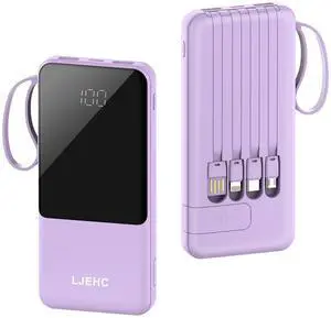 Portable Charger with Built in Cables,10000mAh Slim USB C Power Bank,5 Output 3 Input LED Display High Speed External Battery Pack Travel Phone Charger for iPhone Samsung Pixel LG Moto iPad,Purple