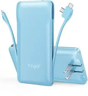 TG90° 10000mAh Power Bank with Built-in AC Wall Plug and Cables, Ultra Slim Phone External Battery Pack Portable Charger Compatible with iPhone and Android Devices