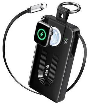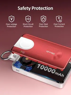 Idealforce 10000mAh Fast Charging Power Bank, Retractable Built-in Cable Portable Charger, High Capacity External Battery Pack with Cables for Apple Watch & iPhone & Android & More Red