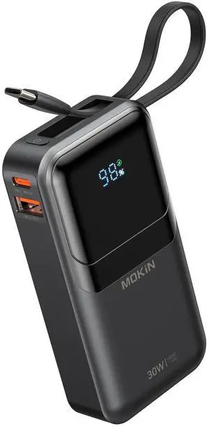 MOKiN Portable Charger, 10000mAh Power Bank, 30W Fast Charging Battery Pack, USB-C, USB A, Bulit in 2 Cables iOS & Type C, Digital Display, Compact PowerBank Compatible with iPhone 16/15/14/13,Black