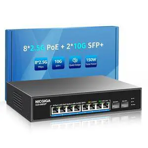 10 Port 2.5Gb PoE Switch Unmanaged with 8 Port 2.5G Base-T PoE+@130W + 2 x 10G SFP+ Uplink, NICGIGA 8 Port 2.5Gbe IEEE802.3af/at Power Over Ethernet Switch, Support WiFi6 AP, NAS, 4K PoE Camera NVR.