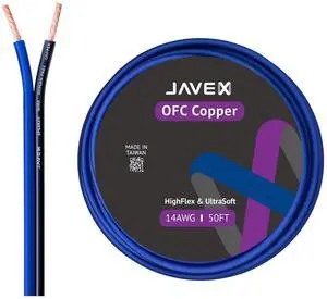 JAVEX 14-Gauge AWG Audio Speaker Wire (50 FT), [OFC Oxygen-Free Copper] HighFlex Thin Flat Cable for Automotive Car Stereo Audio, HI-FI Stereo, Home Theater, Blue/Black