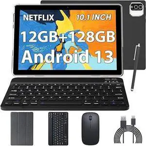 IWEGGO Android 13 Tablet, 10 Inch 12GB RAM+128GB ROM/ 2TB Expandable Tablet, 2.0GHz Quad-core Processor, 1280*800 HD Touch Screen, 5G WiFi6 BT 5.0, 2 in 1 Tablets with Keyboard Case Mouse Stylus Black